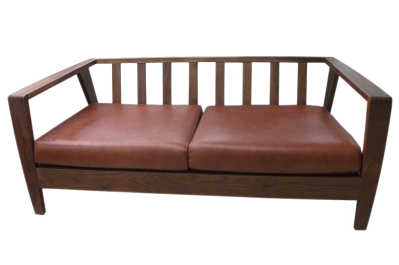 ウオルナット無垢、置きクッション、本革張り、岩倉榮利デザイン、キズに強いセラウッド塗装