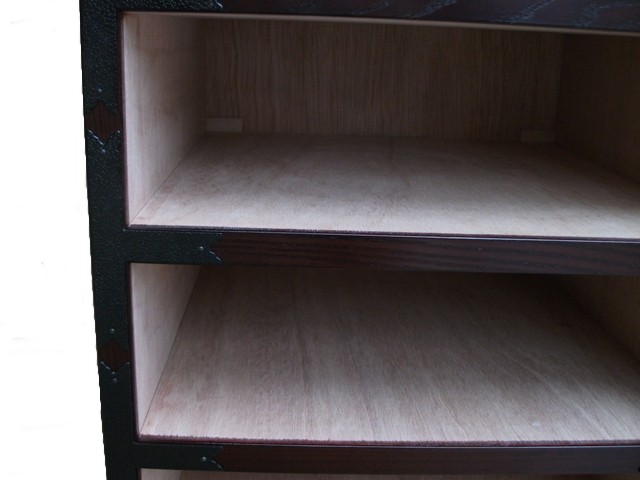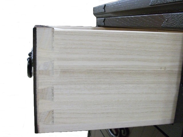 天板・側板・前板は木目のきれいな東北産高級けやき天然杢突板を使用。引き出し内部は桐材ムク、また頑丈な四方箱組みベタ底、接続部は釘を使わないアリ組を採用、また本体も全段に両面張りの棚板加工をし、丈夫でいつまでも使える工法を用いています。さらに本体背板も化粧仕上げを施し美しさにこだわりました。