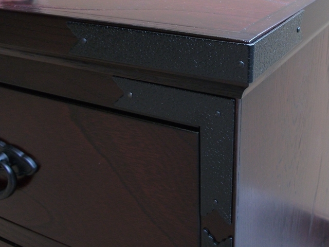 装飾的な用途のほか、タンスの側板と天板や棚口との接合部を補強する目的で取り付けられた金具。時代箪笥の象徴です。