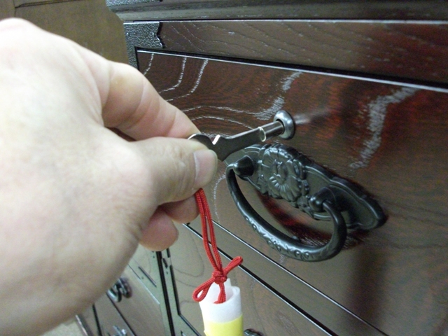 引き出しの全段に錠を装備、大事な物の保管にぴったりです。鍵にはおしゃれなふさが付いています。