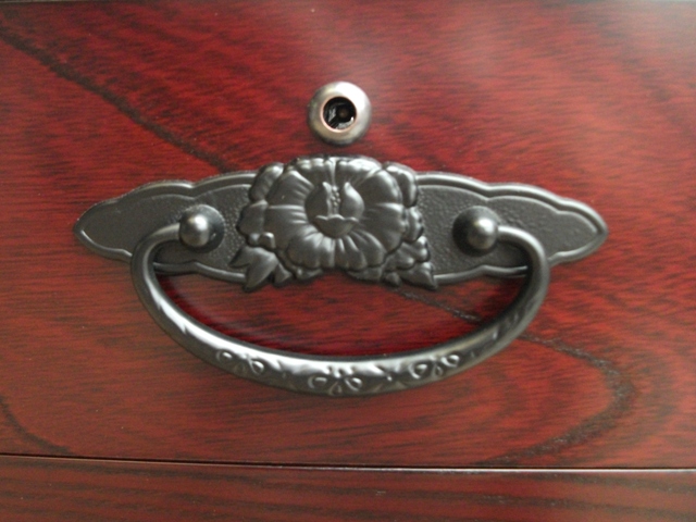 時代箪笥に不可欠なぶらり把手(とって)。ケヤキの杢目とよく似合います。
