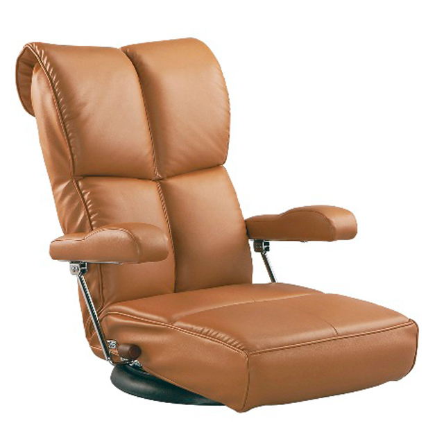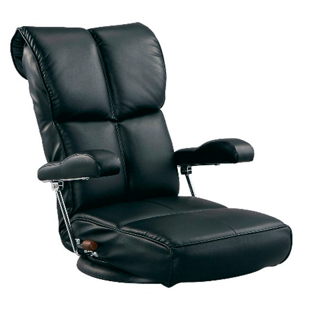 最高級の座り心地をお約束する座椅子です。スムースな風合いのスーパーソフトレザー張り。回転機構付で座ったままレバー操作で13段階に細かくリクライニングが可能。またヘッドリクライニング機能も追加されより細かくポジションを設定できます。肘掛け部は使用しない時は上に跳ね上げることができるため邪魔になりません。カラーは人気のブラックとブラウンの2色からセレクトできます。信頼の日本製です。